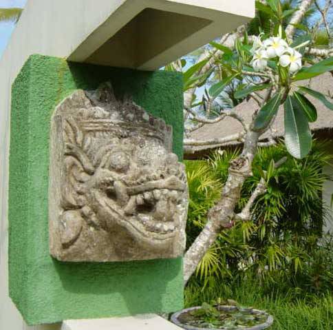 Via the dining area, walking over stepping-stones of the main focus fishpond, one reaches the large living pavilion, where the kitchen and the staff quarters are housed. While traditional Balinese and Javanese materials are used throughout, the pavilions with the thatched roofs appear to be modern, so is most of the furniture.