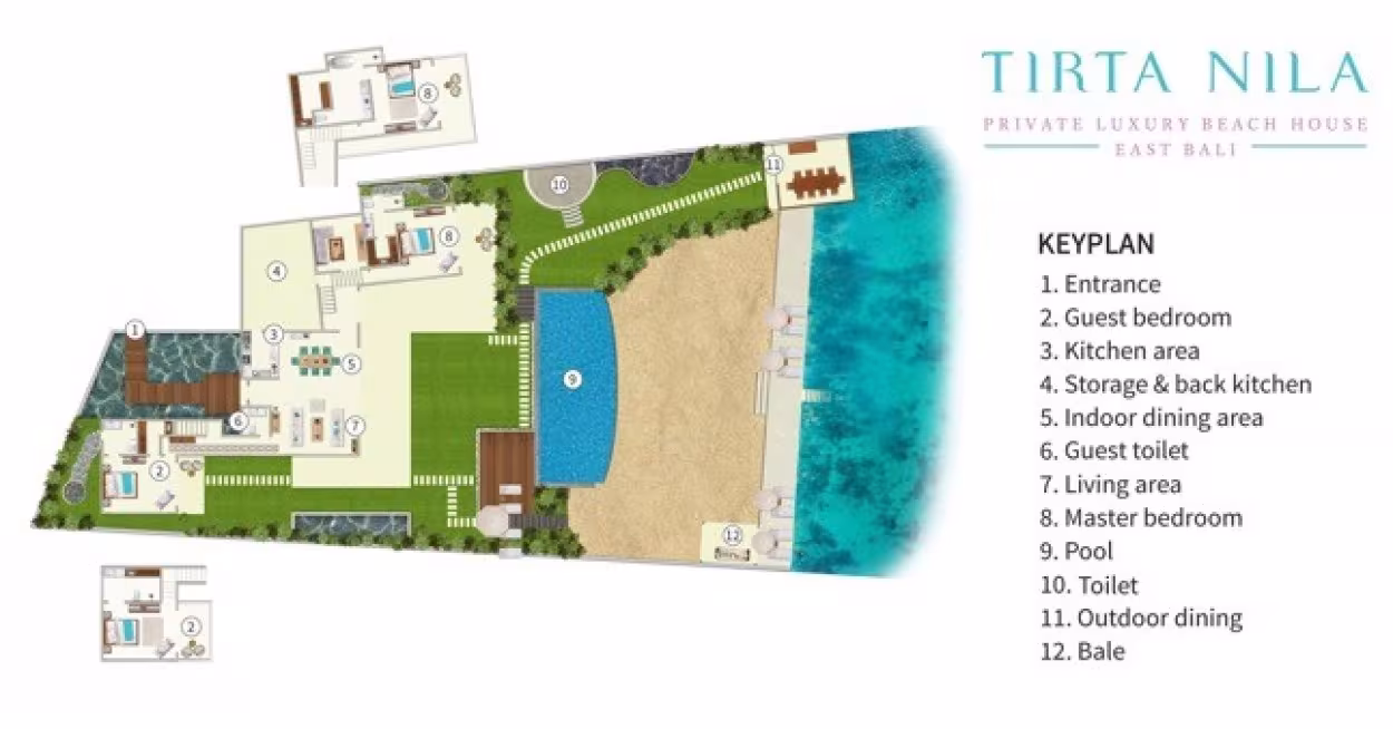 The four bedrooms are substantially proportioned and well appointed, with king-size beds, en-suite bathrooms, air-conditioning, and walk-in wardrobes.The upstairs master bedroom complete with wrap around balcony, has a luxurious en-suite complete with designer bathtub, and is accessed via private staircase directly from the living and dining area. The downstairs master sits directly below and offers immediate access to the gardens and swimming pool from the large wrap around terraces, and also offers a walk-thru en-suite leading to a private tropical outdoor shower. Bedrooms three and four are set back from the living room in their own private area of the property, with each room having separate access via hallway or stairway. With uninterrupted sea views from the balcony or terrace, these rooms are an area of seclusion and privacy at Tirta Nila, with the upstairs room offering both rural and sea views, the downstairs bedroom offers not only sea views but also has a walk-thru en-suite into a private garden courtyard complete with outdoor tropical shower.